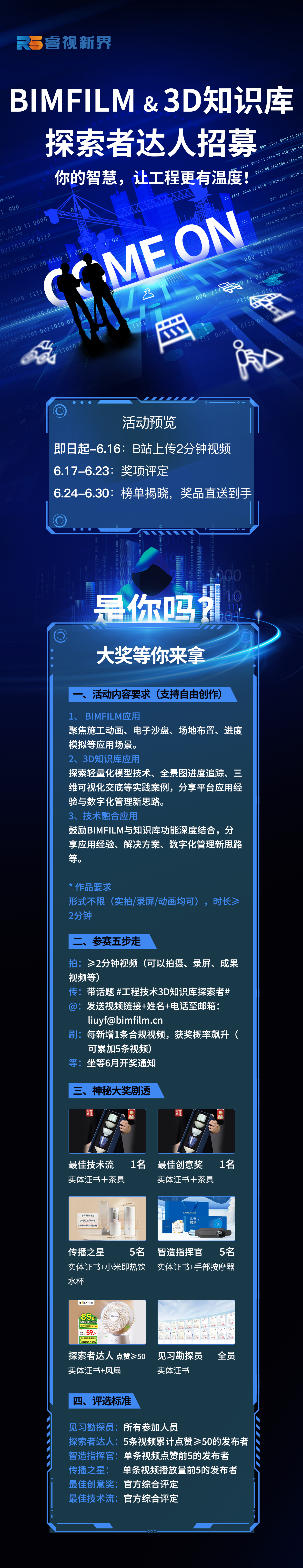 即日起至6.16,用2分鐘視頻秀出你的BIMFILM和3D知識(shí)庫(kù)創(chuàng)意!聚焦施工動(dòng)畫、輕量化模型等技術(shù)應(yīng)用,或分享數(shù)字化管理新思路。帶話題#工程技術(shù)3D知識(shí)庫(kù)探索者# 上傳B站,投稿至郵箱即可參與。??